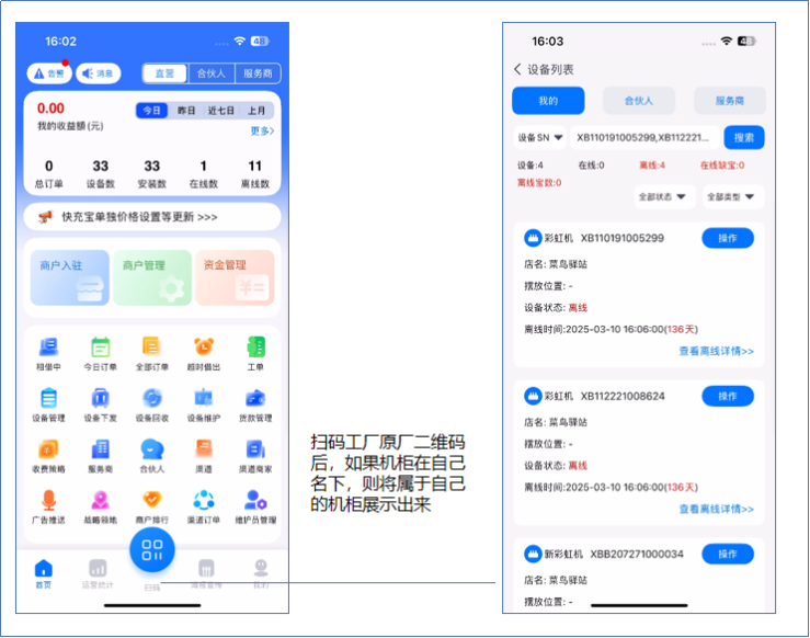 扫码工厂外箱码后,会搜索出属于自己的设备。
