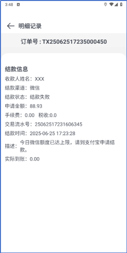 微信提现封顶导致的结款失败,优化失败原因提示。更改为今日微信额度已达上限,请到支付宝申请结款。