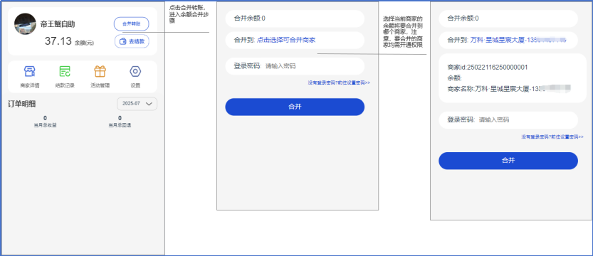 注意,该功能需特批开放。普通商家余额只能合并至普通商家,直营商家余额只能合并到直营商家。